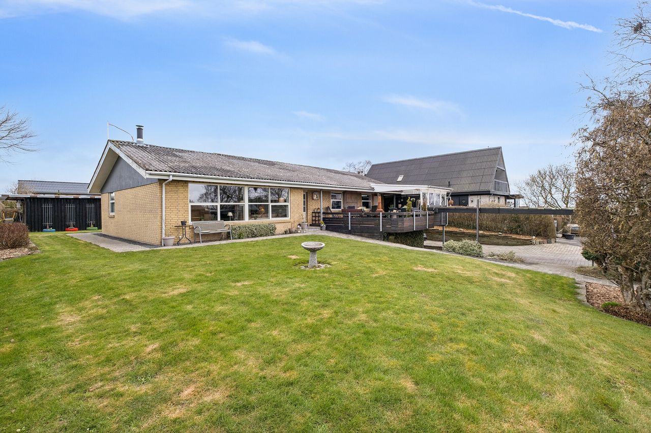 Udenfor finder du en skøn og velplejet have, der er perfekt til leg og afslapning. Den overdækkede træterrasse er ideel til middage udendørs, og giver gode muligheder for at nyde solen hele dagen. Her finder du desuden et rummeligt skur med endnu en overdækket terrasse, en garage med fjernbetjent port samt en dobbelt indkørsel.