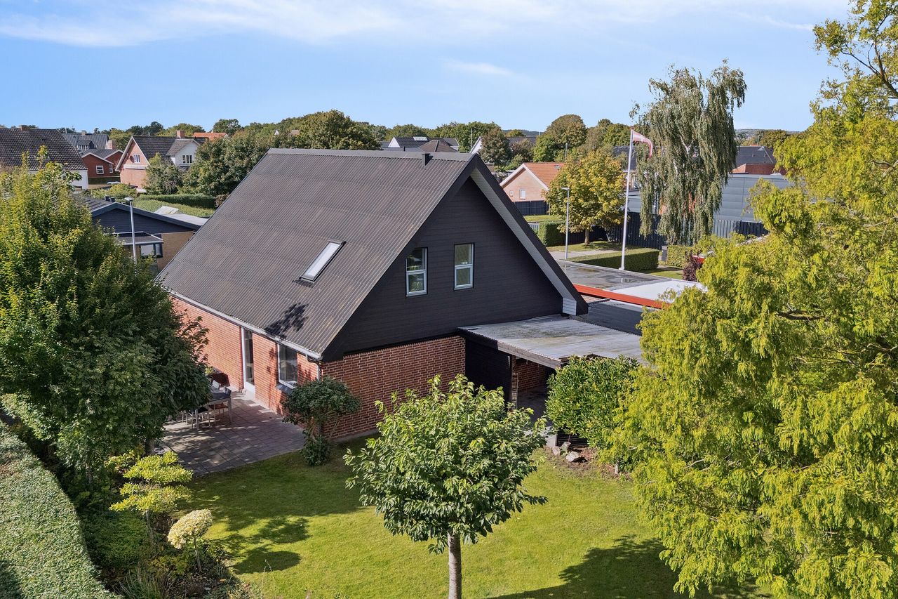 Når du træder ind i huset, mødes du af et smukt køkken, der er åbent forbundet med stuen. Dette skaber et lyst og indbydende opholdsrum, hvor familien kan samles omkring madlavningen eller nyde hyggelige aftener sammen. Fra stuen er der direkte adgang til en overdækket terrasse - det ideelle sted at nyde de lange sommeraftener eller morgenkaffen i det fri.