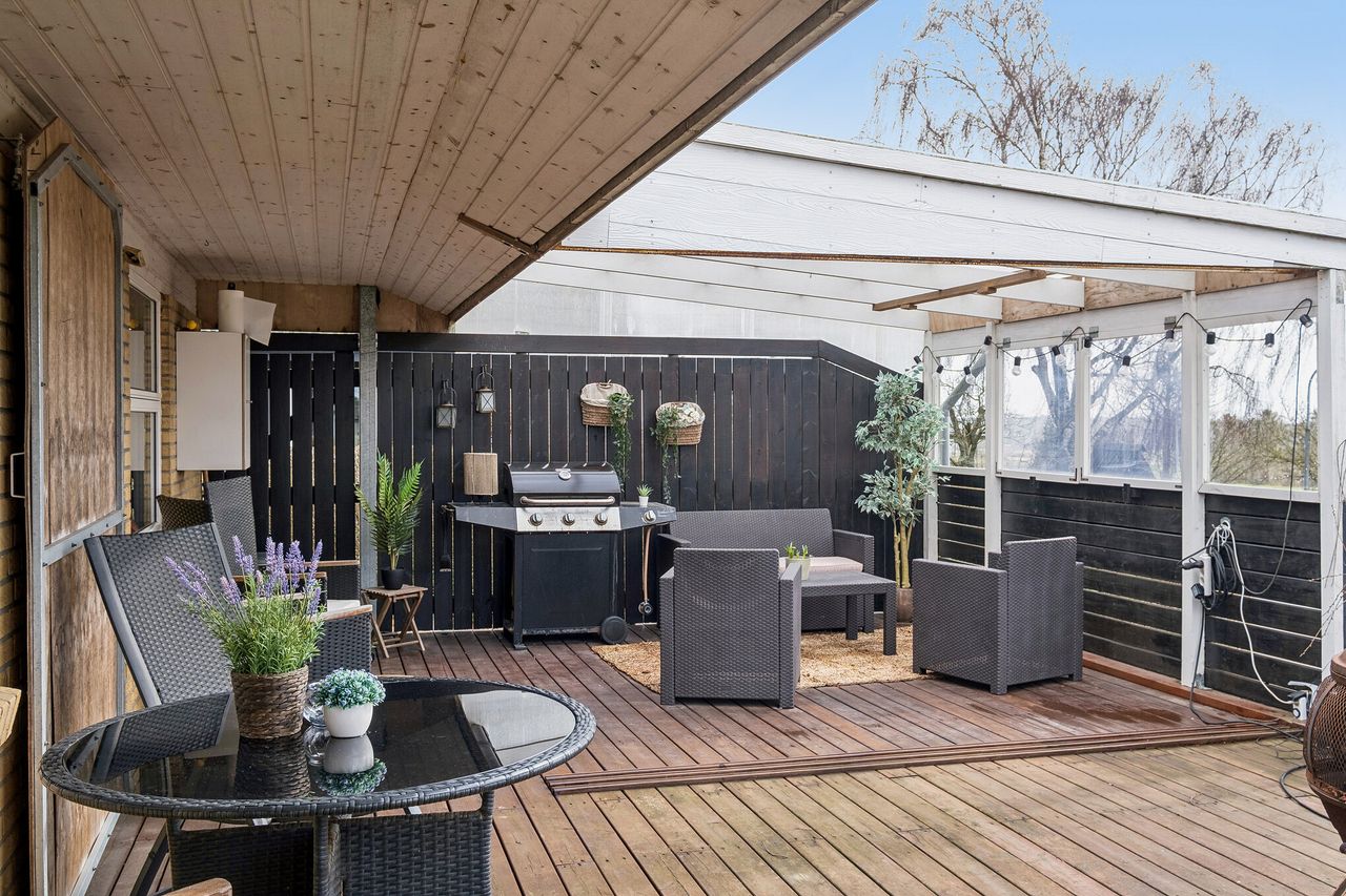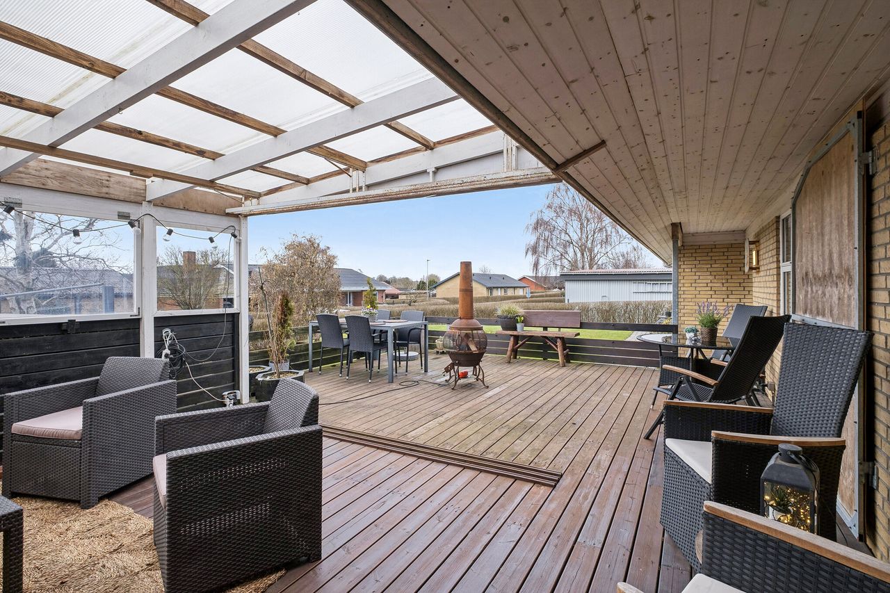 Udenfor finder du en skøn og velplejet have, der er perfekt til leg og afslapning. Den overdækkede træterrasse er ideel til middage udendørs, og giver gode muligheder for at nyde solen hele dagen. Her finder du desuden et rummeligt skur med endnu en overdækket terrasse, en garage med fjernbetjent port samt en dobbelt indkørsel.